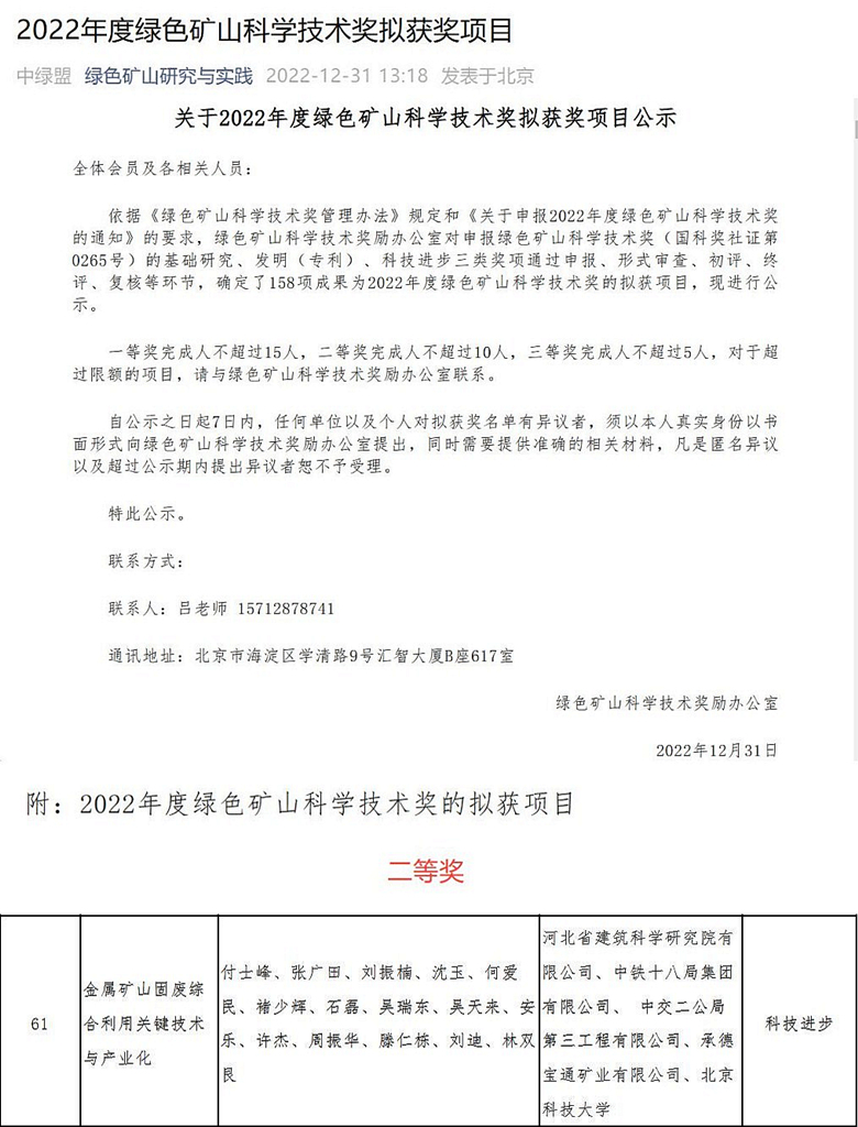 我公司申報的“金屬礦山固廢綜合利用關(guān)鍵技術(shù)與產(chǎn)業(yè)化”項目依據(jù)《綠色礦山科學技術(shù)獎管理辦法》規(guī)定和《關(guān)于申報2022年度綠色礦山科學技術(shù)獎的通知》的要求,經(jīng)綠色礦山科學技術(shù)獎勵辦公室對申報綠色礦山科學技術(shù)獎(國科獎社證第0265號)的基礎(chǔ)研究、發(fā)明(專利)、科技進步三類獎項通過申報、形式審查、初評、終評、復核等環(huán)節(jié),確定我公司申報的“金屬礦山固廢綜合利用關(guān)鍵技術(shù)與產(chǎn)業(yè)化”榮獲2022年度綠色礦山科學技術(shù)獎二等獎。