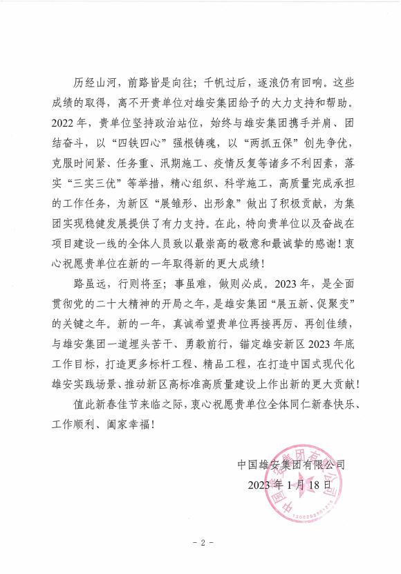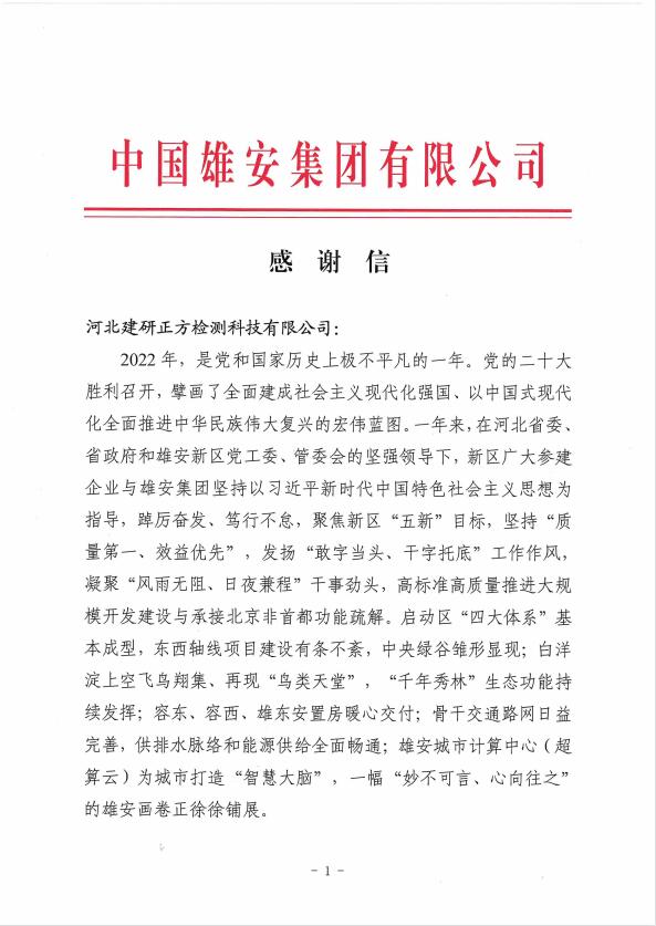 近日,建研正方公司收到雄安集團發(fā)來的感謝信,對建研正方公司2022年為雄安新區(qū)發(fā)展建設(shè)所做出貢獻表示感謝。